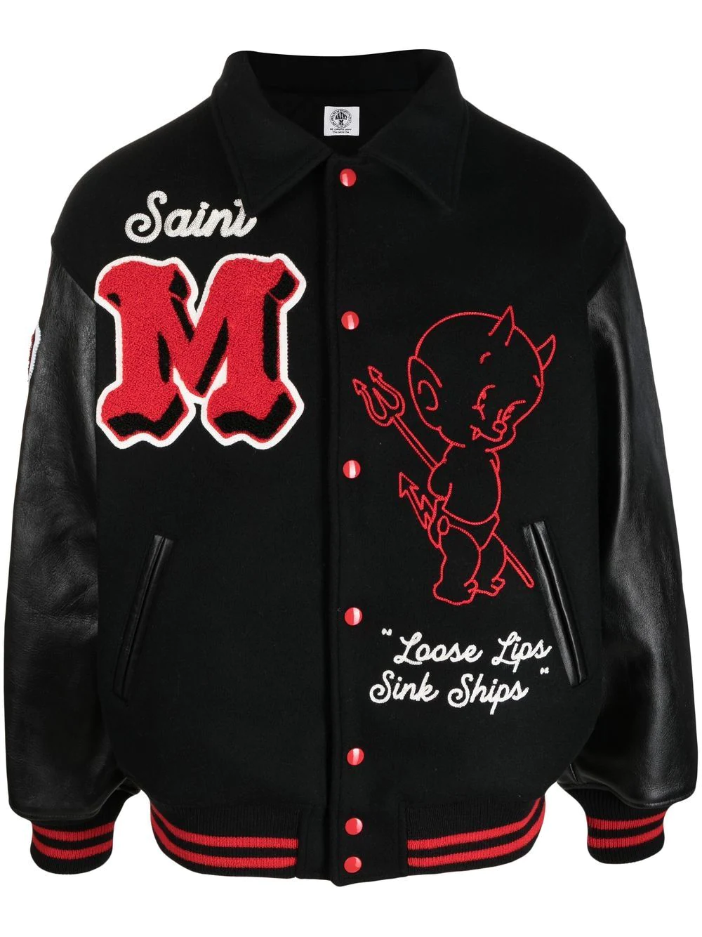 The SAINT Varsity Jacket features a bold black and red color scheme that exudes confidence and style. The vibrant red accents stand out against the classic black base, creating a striking contrast that grabs attention. The “SAINT” slogan and the prominent “M” logo patches further enhance the jacket’s edgy and sporty appeal.