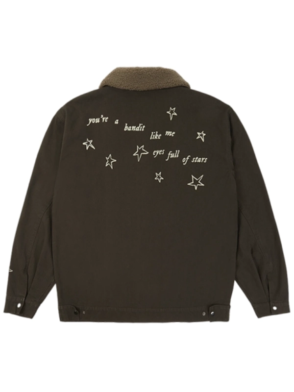 One of the standout features of this jacket is its shirt-style shearling collar, which adds a touch of rustic charm and warmth. Shearling is known for its soft, insulating properties, making this collar perfect for colder days. The shirt-style design creates a relaxed yet refined look, balancing casual comfort with a touch of sophistication. The collar also adds visual interest to the jacket, setting it apart from typical outerwear options.