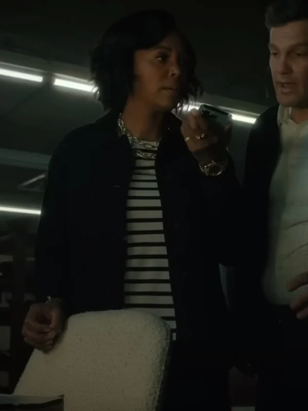 The full-length sleeves provide complete coverage, making the jacket suitable for colder weather while maintaining a polished, streamlined look. Finished in a timeless black color, this jacket is incredibly versatile and pairs well with almost any outfit. With its classic design and thoughtful details, the Aisha Tyler-inspired wool jacket is a must-have addition to any wardrobe.